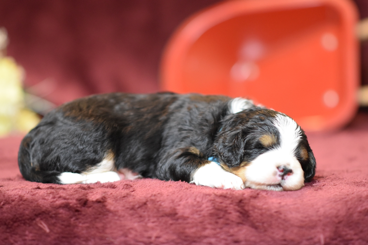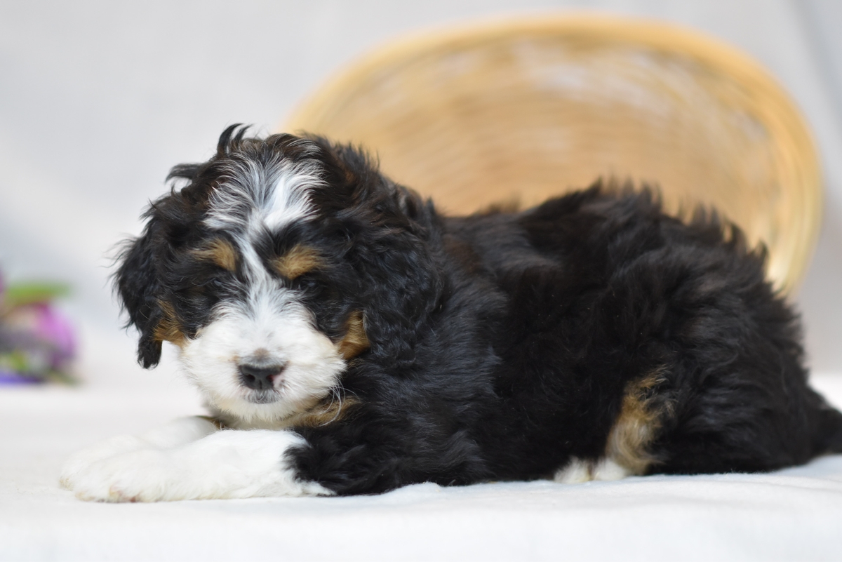 Inferno is an F1 Mini Bernedoodle and will average between 35-45 lbs. when full grown. He is ready to go home on April 17th 2024.