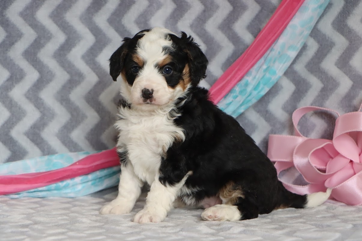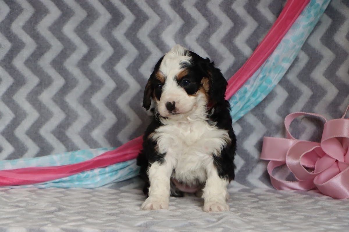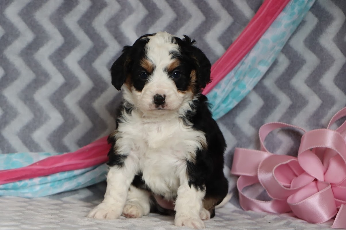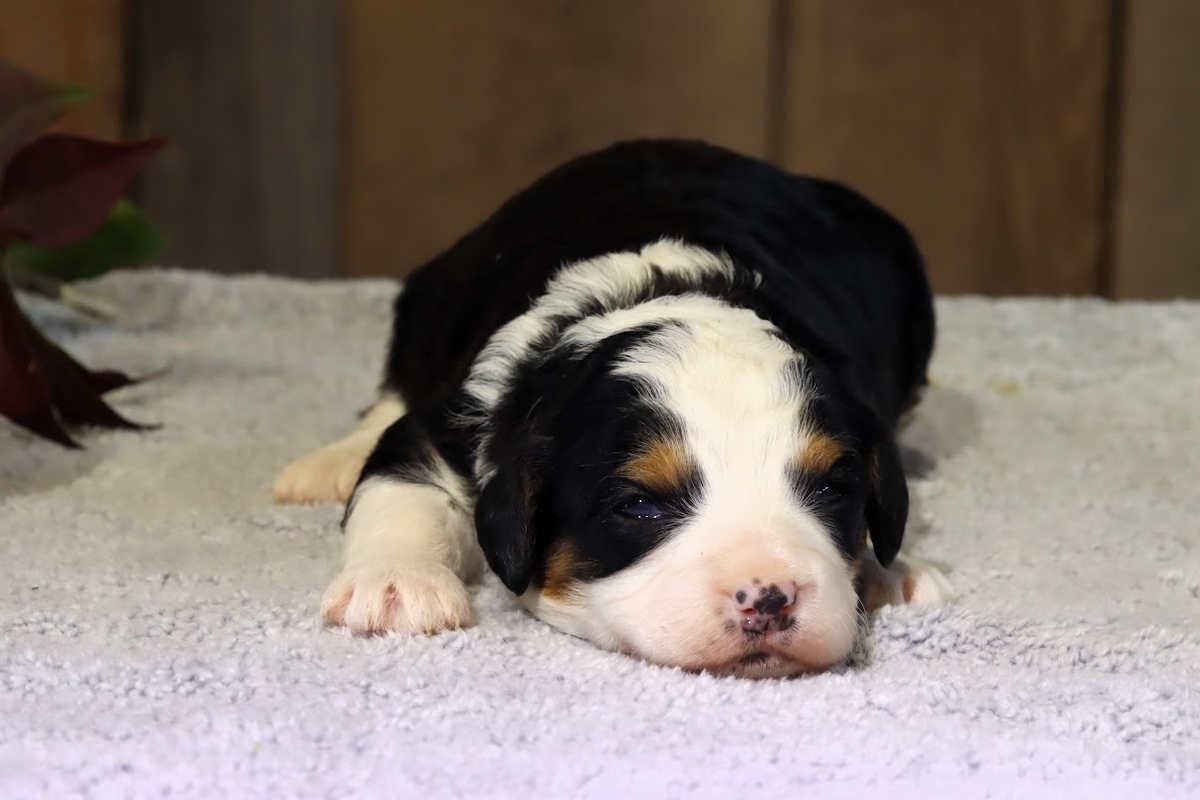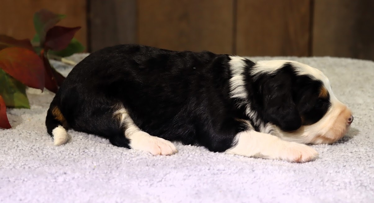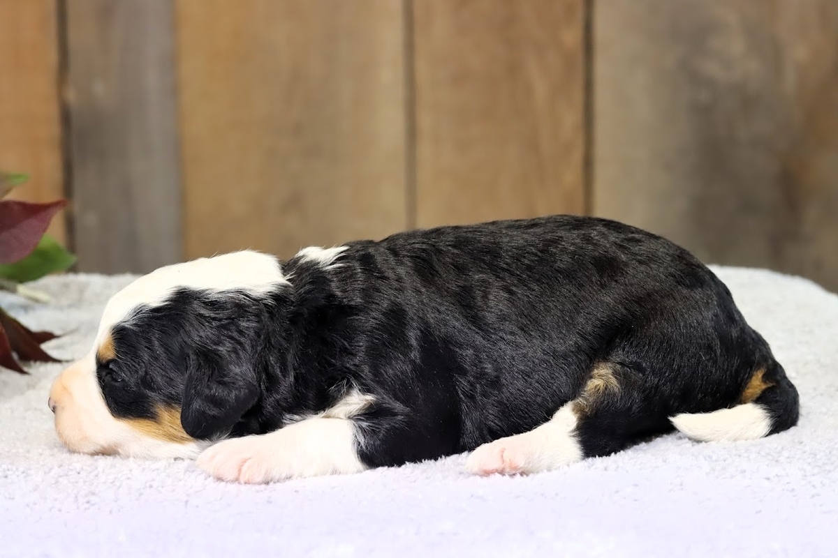 Paisley is an F1 Mini Bernedoodle and her litter will average in the 30-40 lb. weight range when full grown. She is ready to go home on 12/15/25.