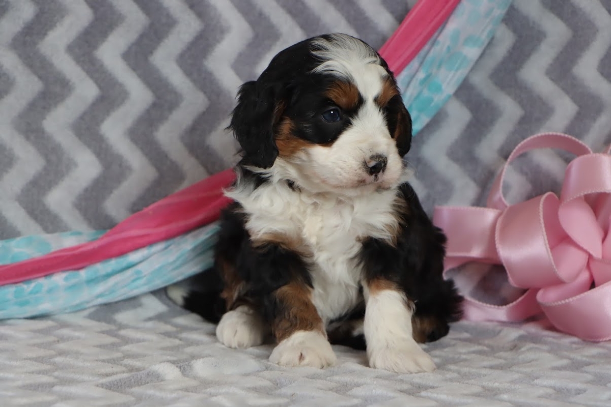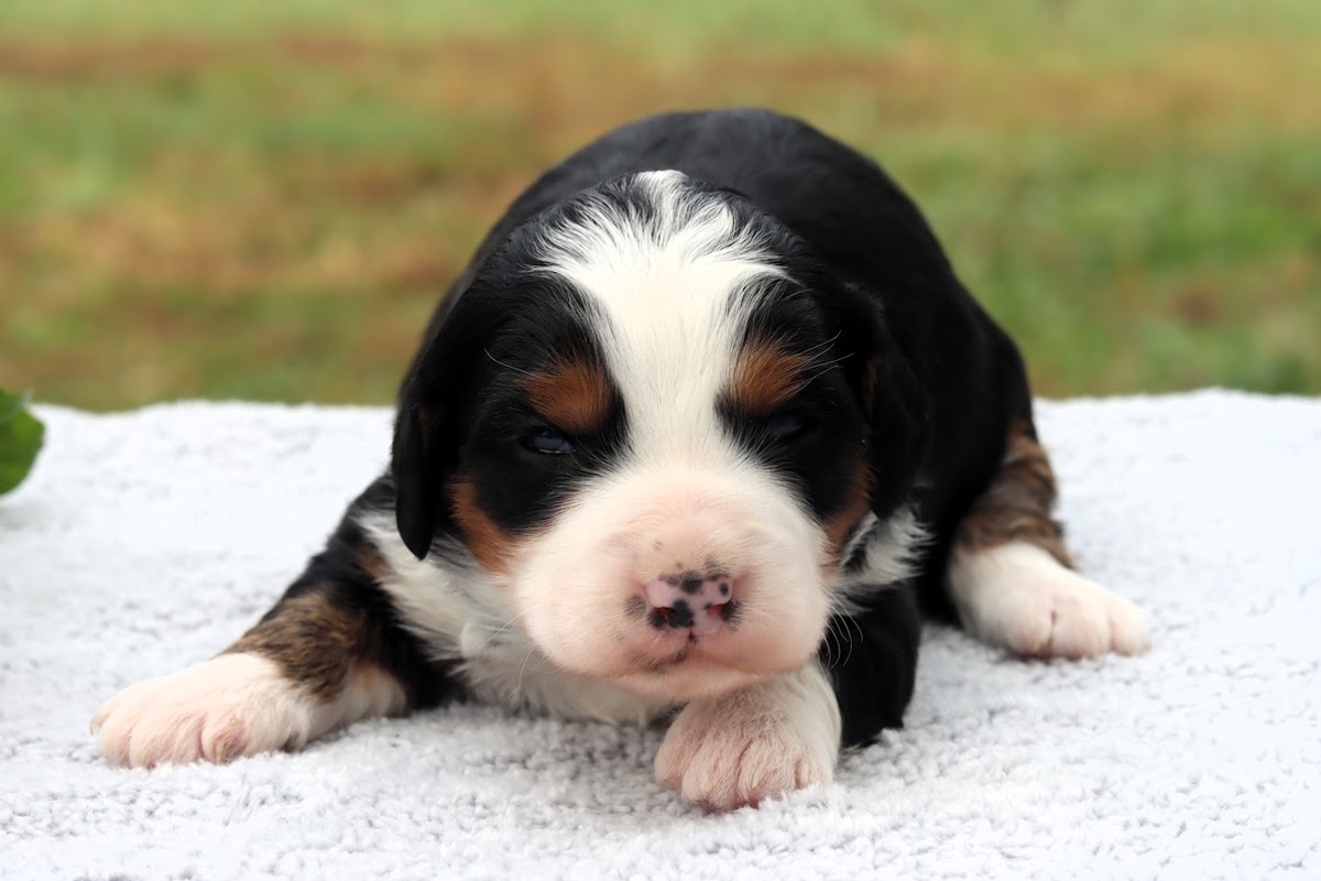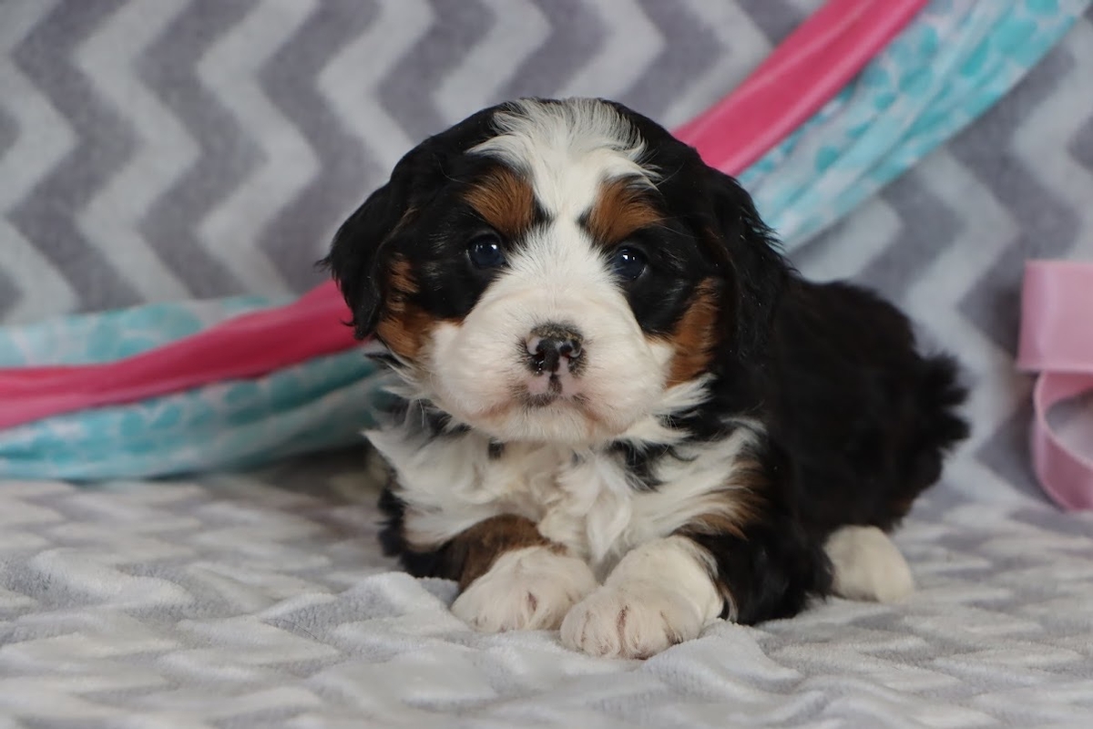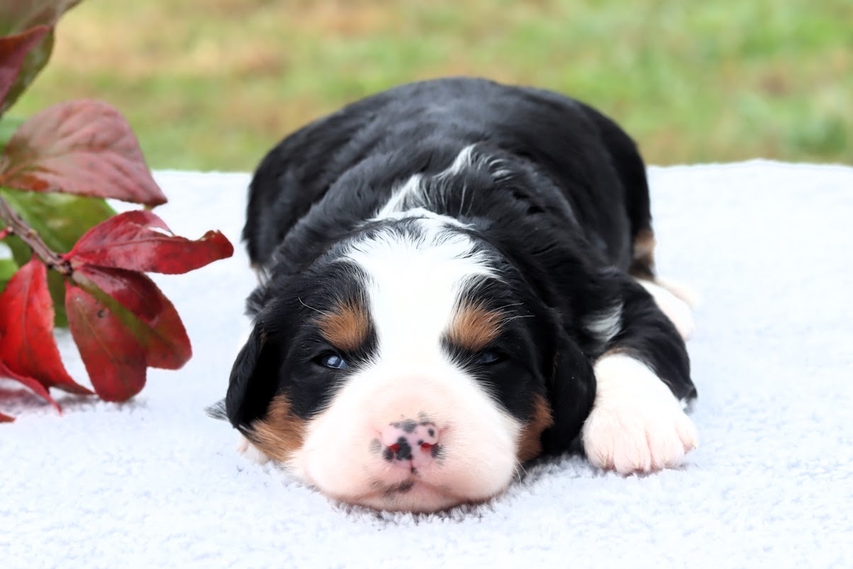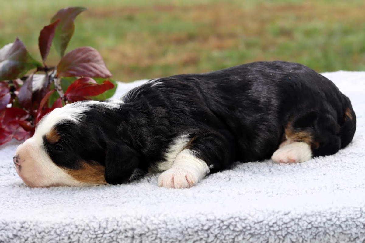 Penny is an F1 Mini Bernedoodle and her litter will average in the 30-40 lb. weight range when full grown. She will be ready to go home on 12/15/25.