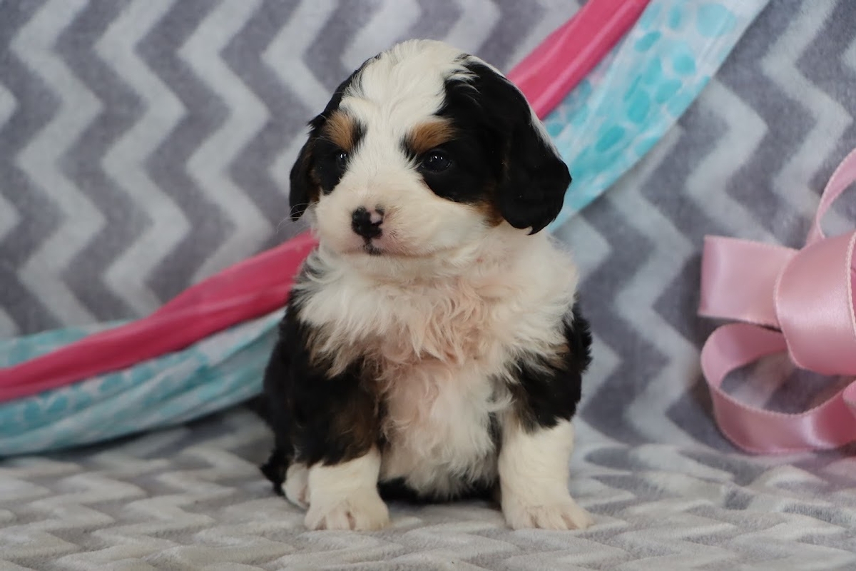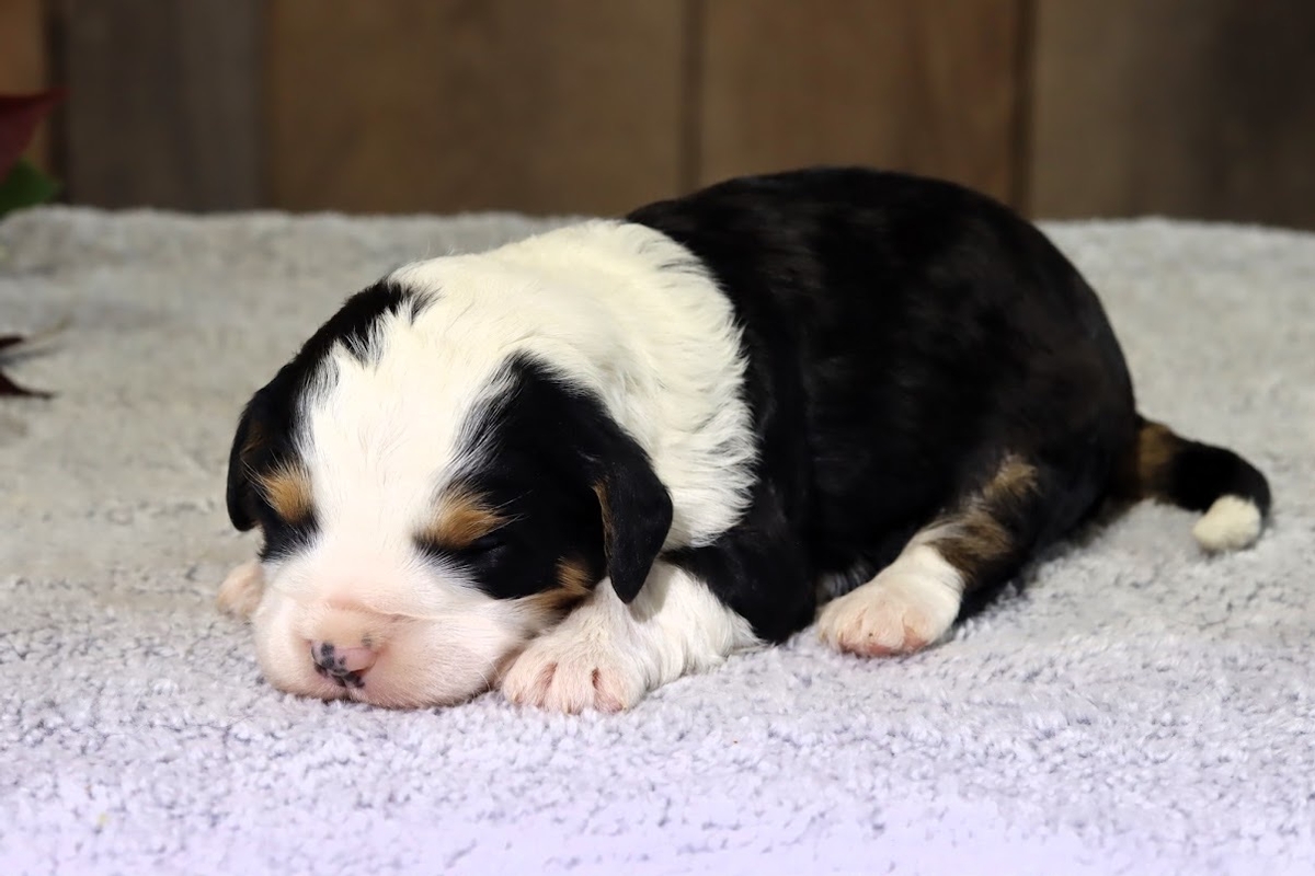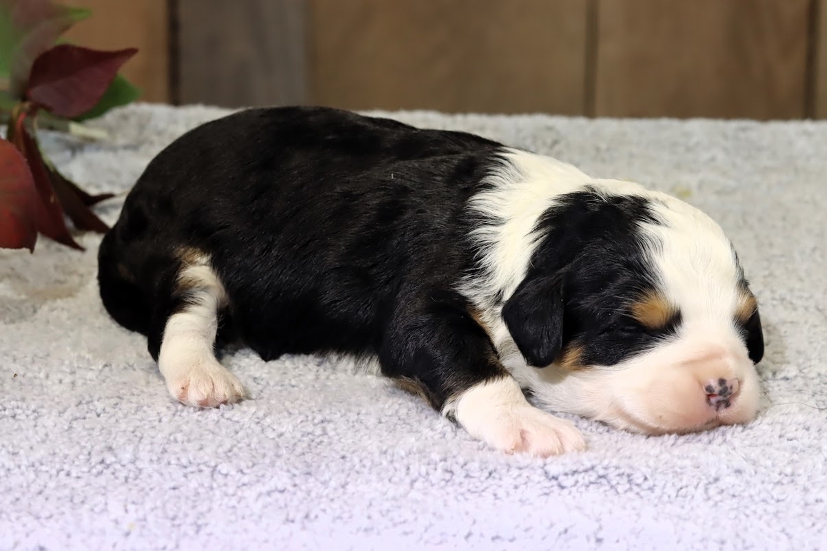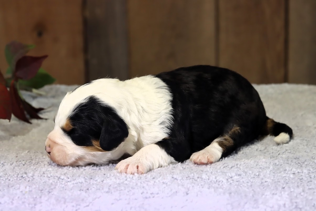 Pepper is an F1 Mini Bernedoodle and his litter will average in the 30-40 lb. weight range when full grown. He is ready to go home on 12/15/25.