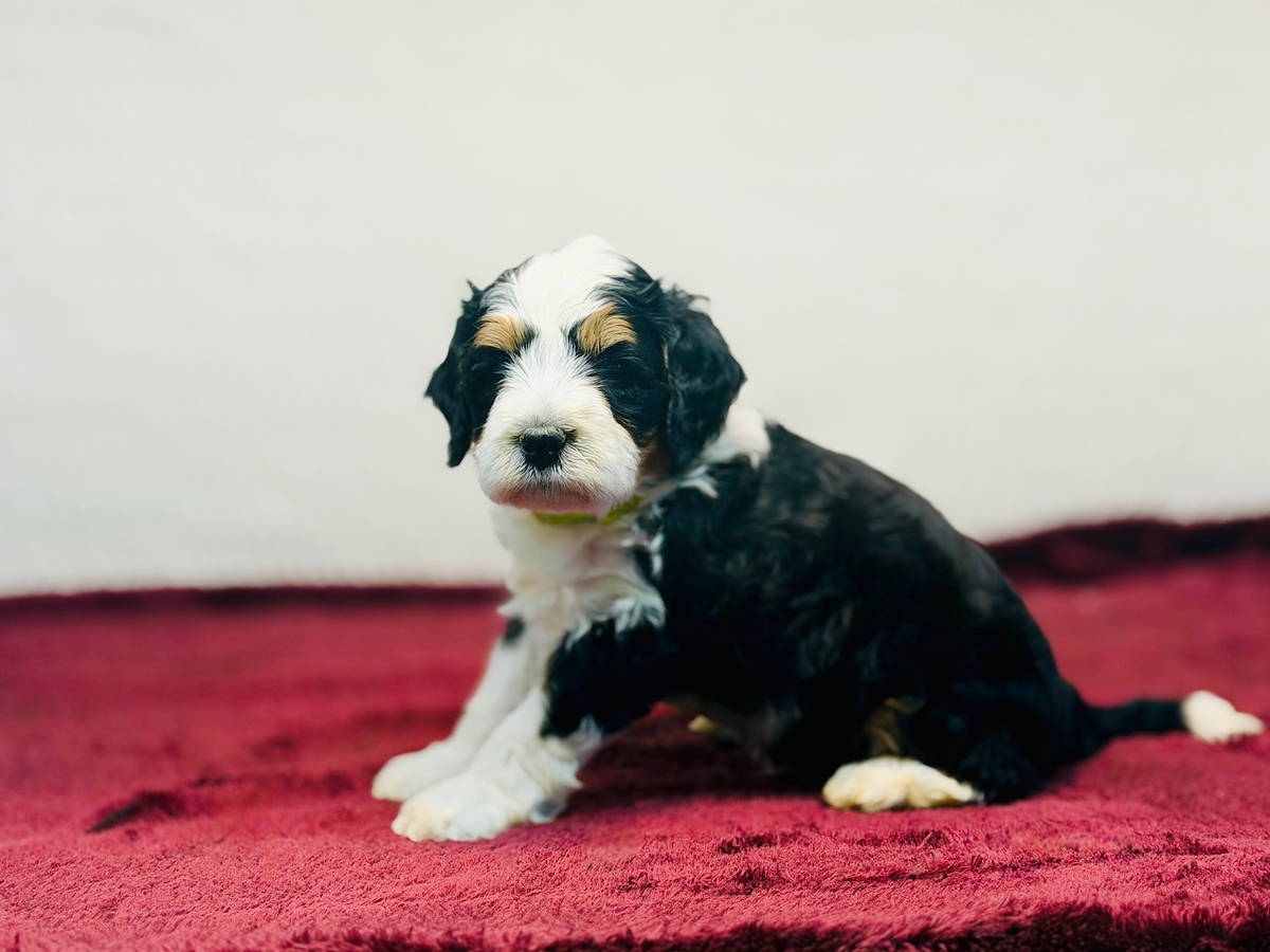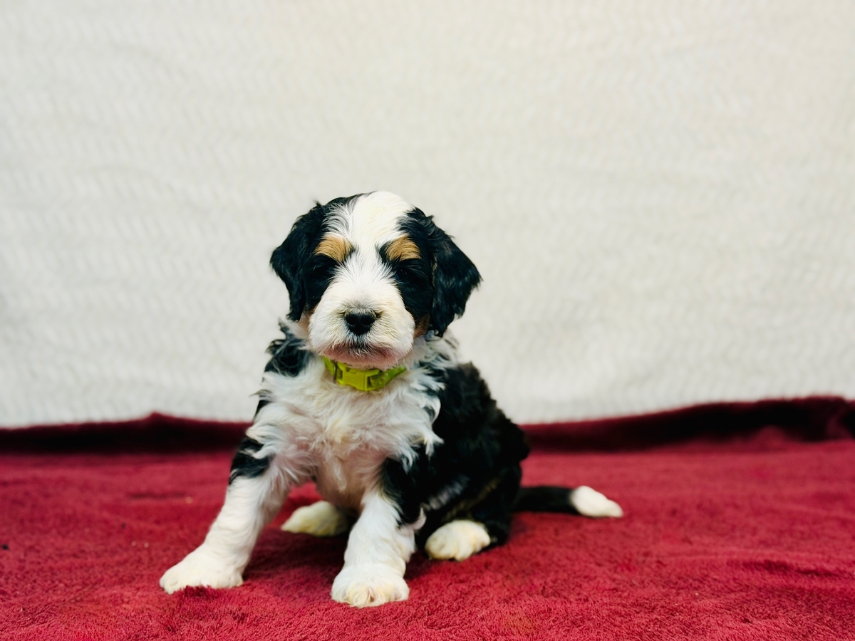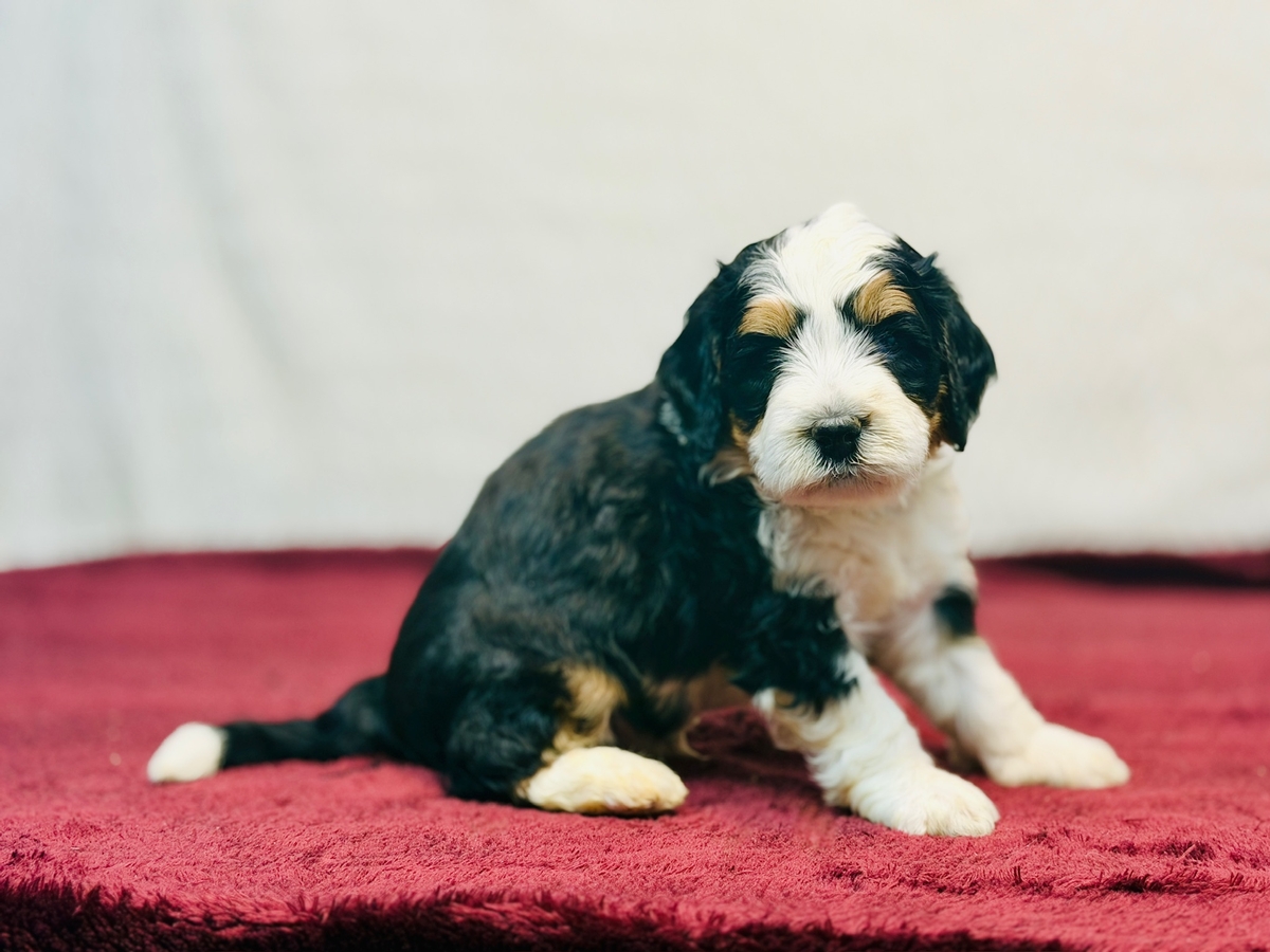 Star is an F1 Mini Bernedoodle and his litter will average in the 30-40 lb. weight range when full grown.. He will be ready to go home on 1/24/26.