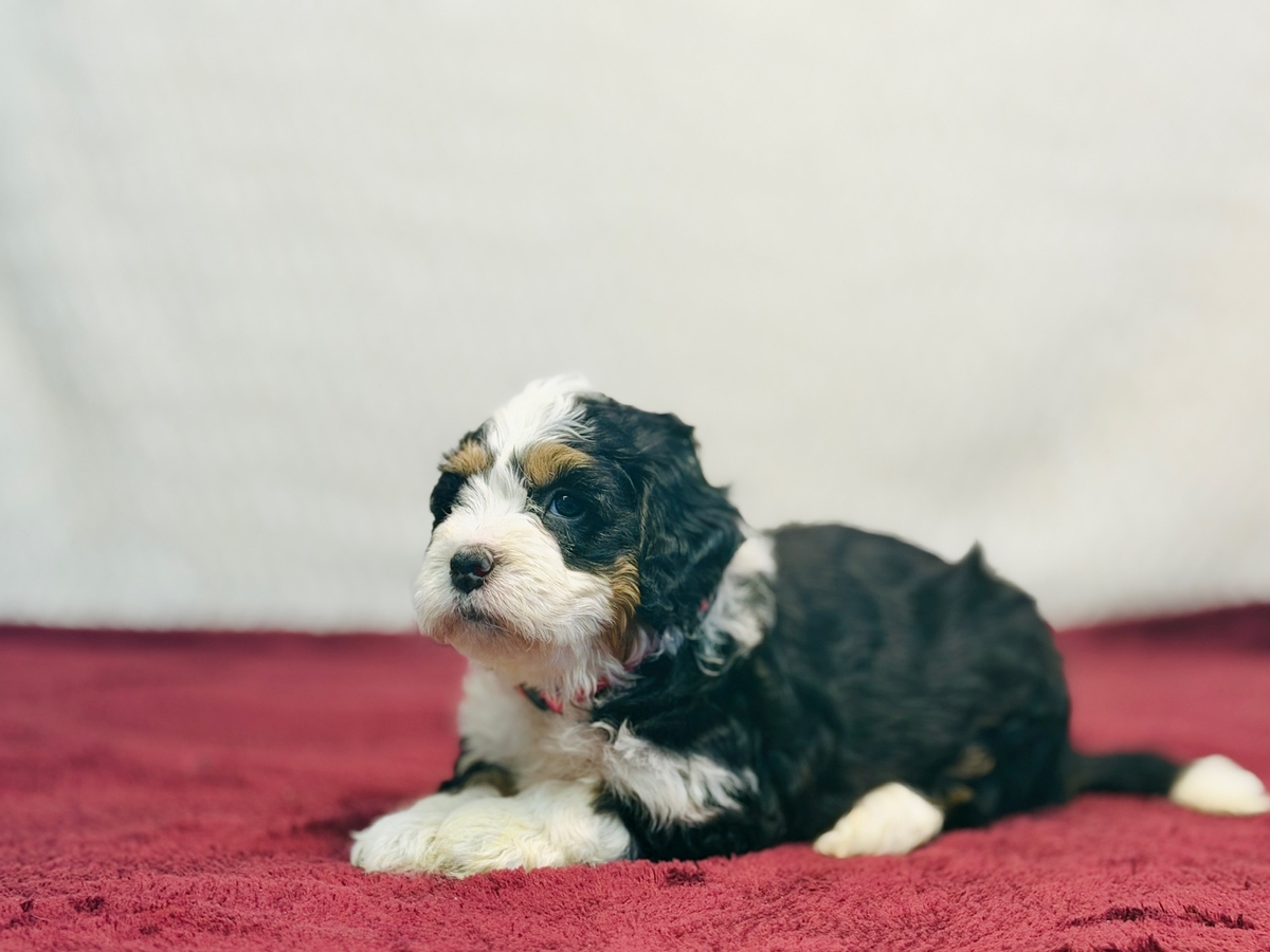 Sundae is an F1 Mini Bernedoodle and her litter will average in the 30-40 lb. weight range when full grown. She will be ready to go home on 1/24/26.