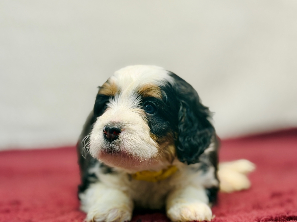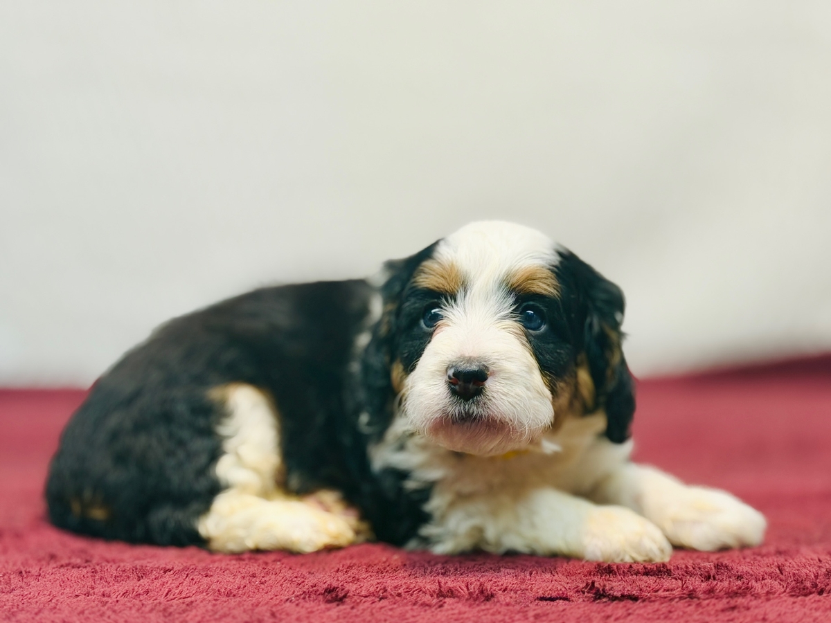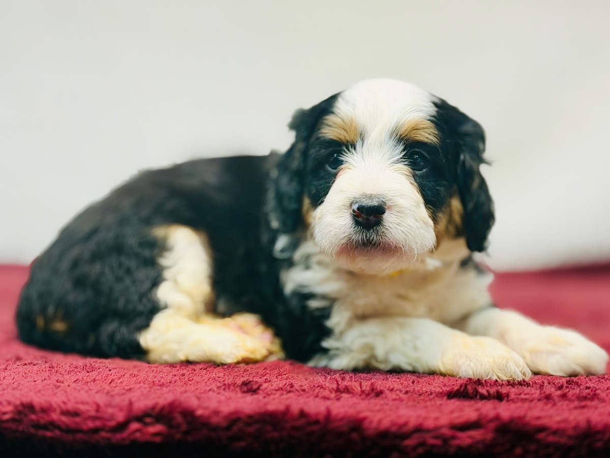 Sunny is an F1 Mini Bernedoodle and his litter will average in the 30-40 lb. weight range when full grown. He will be ready to go home on 1/24/26.
